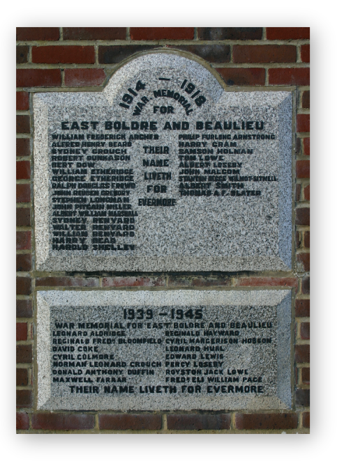 The war memorial at East Boldre Village Hall has recently been restored. The memorial shows 26 names of servicemen killed in the First World War and 14 Names of servicemen killed in the Second World War.