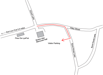 There is plenty of on-site parking via the entrance in Burnt House Lane. When exiting the main parking area in front of the hall, turn right, then first right into Burnt House Lane. Car park is on the right.